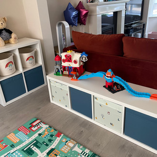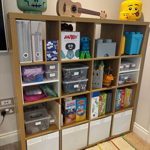 For this client she had some storage but it wasn't working for her - so we replaced the book shelf in the nook with the 4 box Kallax (IKEA) and added a long Kallax (IKEA) also. The issue here was toys were too big to fit on the shelves and there was lots of very small toys. So we also added a Trofast (IKEA) so cater for smaller bits. As per the rule BIG TOYS = BIG STORAGE, SMALL TOYS = SMALL STORAGE. Everything is very accessible for small kiddies and labels both words and pictures help to maintain the system.